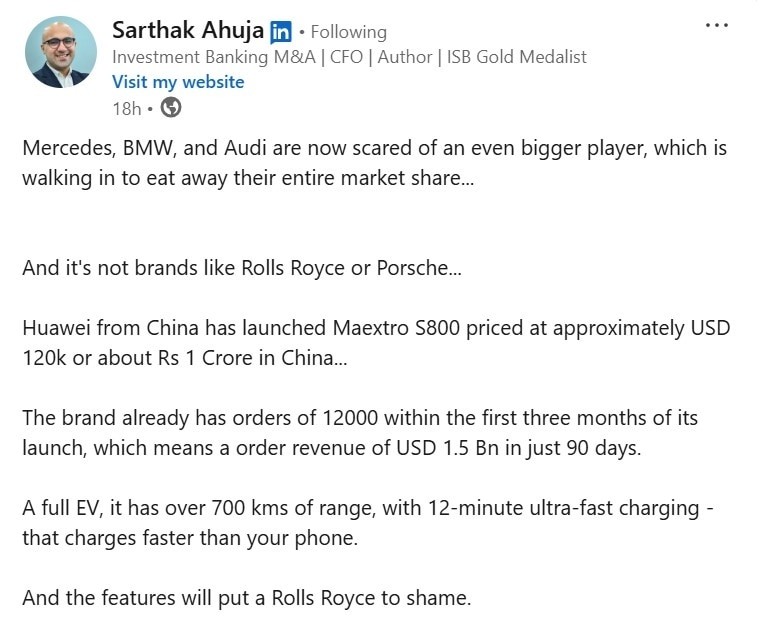 Sarthak Ahuja pointed to Huawei’s Maextro S800, a $120,000 luxury EV with 700 km range and 12-minute ultra-fast charging, offering Maybach-level features at a fraction of the price.The global luxury car market is undergoing a dramatic shift, with Chinese automakers rapidly emerging as strong challengers to established European brands. Investment banker Sarthak Ahuja, in a recent LinkedIn post, argued that companies such as Mercedes, BMW, Audi, and Porsche are “facing the heat” as Chinese firms bring high-tech, competitively priced electric vehicles (EVs) into the premium and ultra-luxury space.