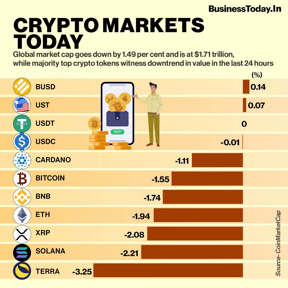 Cryptocurrency markets have shrunk as major top tokens bleed red in the last 24 hour. The global market cap is down by 1.49 per cent in the last 24 hours and is at $1.71 trillion as of 7:30 AM IST, CoinMarketCap data showed.