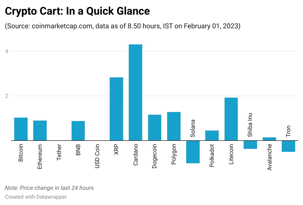 Bitcoin regained $23,000-mark, thanks to a slight rise in its pirce. However, Ethereum remained below $1,600-level despite a recovery.Bitcoin and other major crypto tokens were edged higher on Wednesday, beating the expectations, and delivering strong gains in the month of January. Traders will be awaiting the US Fed's rate hike announcement and India's union budget announcement for the crypto industry.