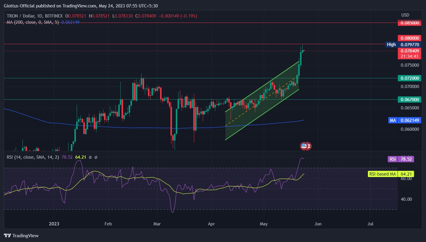 Tech View by Giottus Crypto Platform Tron (TRX) has witnessed a massive rally in the last week and continues to gain momentum. The asset has breached the ceiling of the rising channel ($0.076 level), which signals an inherent bullishness.