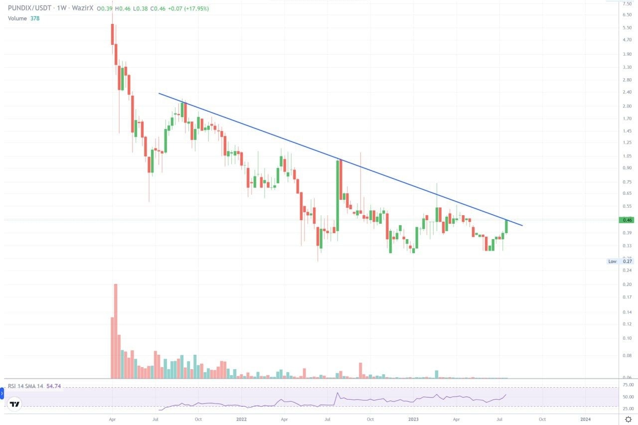 On the weekly time frame, the PUNDIX/USDT chart is on the verge of breaking out of the descending trendline. The RSI has broken above 80 for the first time in nearly a year and the token could continue to dominate for a few more weeks.. The next resistance is expected at $0.48 and a strong support is expected at the $0.31 level.(Views and recommendations given in this section are the analysts' own and do not represent those of Business Today. Please consult your financial adviser before taking any position in the asset/s mentioned.)