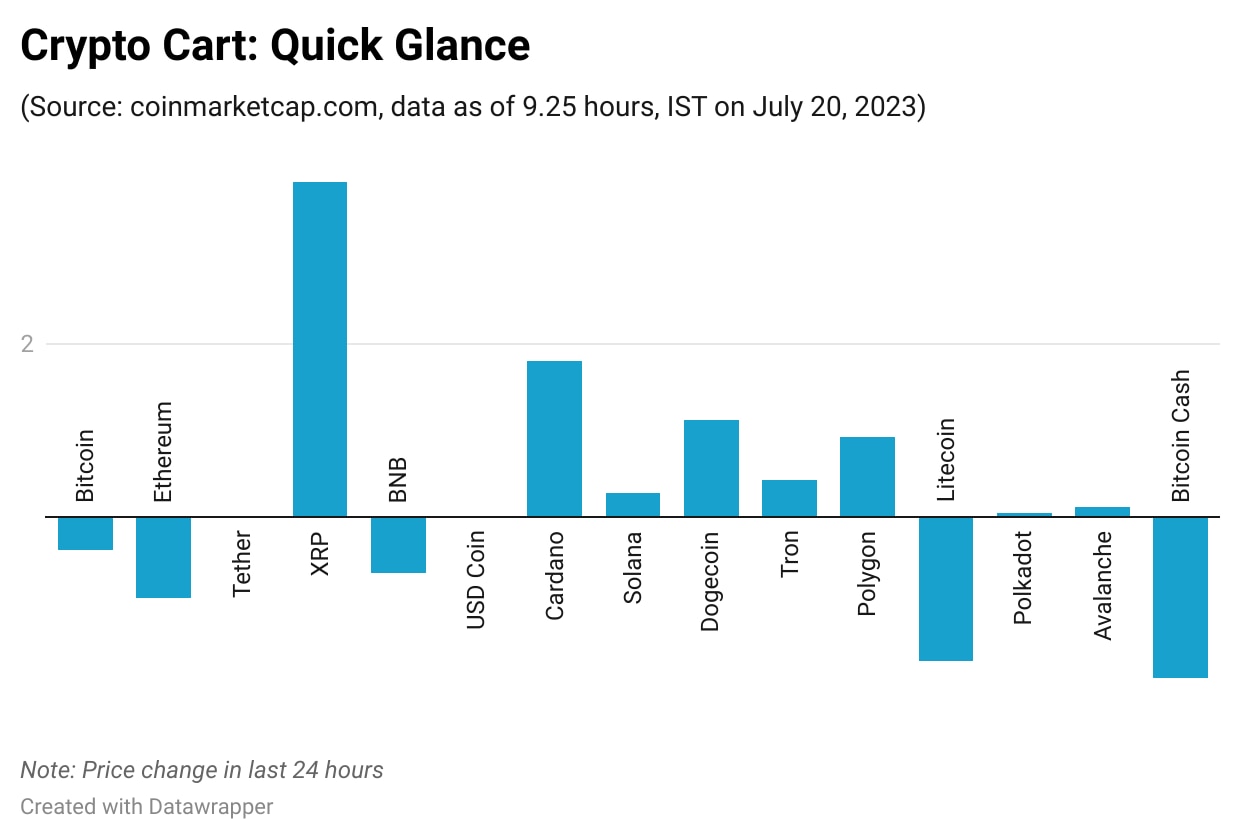The global cryptocurrency market cap was trading slightly lower, falling to $1.21 trillion-mark, as it declined marginally, less than a per cent in the last 24 hours.Bitcoin and other crypto tokens were mixed on Thursday but breached the key psychological levels as the euphoria over Ripple's partial legal victory and Bitcoin ETFs fizzled out. The digital asset market is waiting for economic data and key events to make a decisive direction. Bitcoin continued to dip slightly and the largest crypto token slipped below $30,000-mark. However, Its largest peer, Ethereum, tumbled almost a per cent and breached the $1,900-level. Price in the action altcoins was mixed but no major action was seen in the early trade. Top crypto tokens were trading mixed on Thursday, with a positive bias. Among the gainers, XRP rose 4 per cent, while Cardano rallied 2 per cent. Dogecoin and Polygon were up a per cent each. On the contrary, Bitcoin Cash and Litecoin dropped 2 per cent each in the early trade, while BNB shed a per cent. The global cryptocurrency market cap was trading slightly lower, falling to $1.21 trillion-mark, as it declined marginally, less than a per cent in the last 24 hours. However, the total trading volumes dropped more than 6 per cent to $30.87 billion. The G-20 Financial Stability Board has released a set of recommendations for regulating crypto assets and stablecoins. The recommendations call for stronger oversight of crypto asset activities and markets, and they also specifically address global stablecoin arrangements, said CoinDCX Research Team.