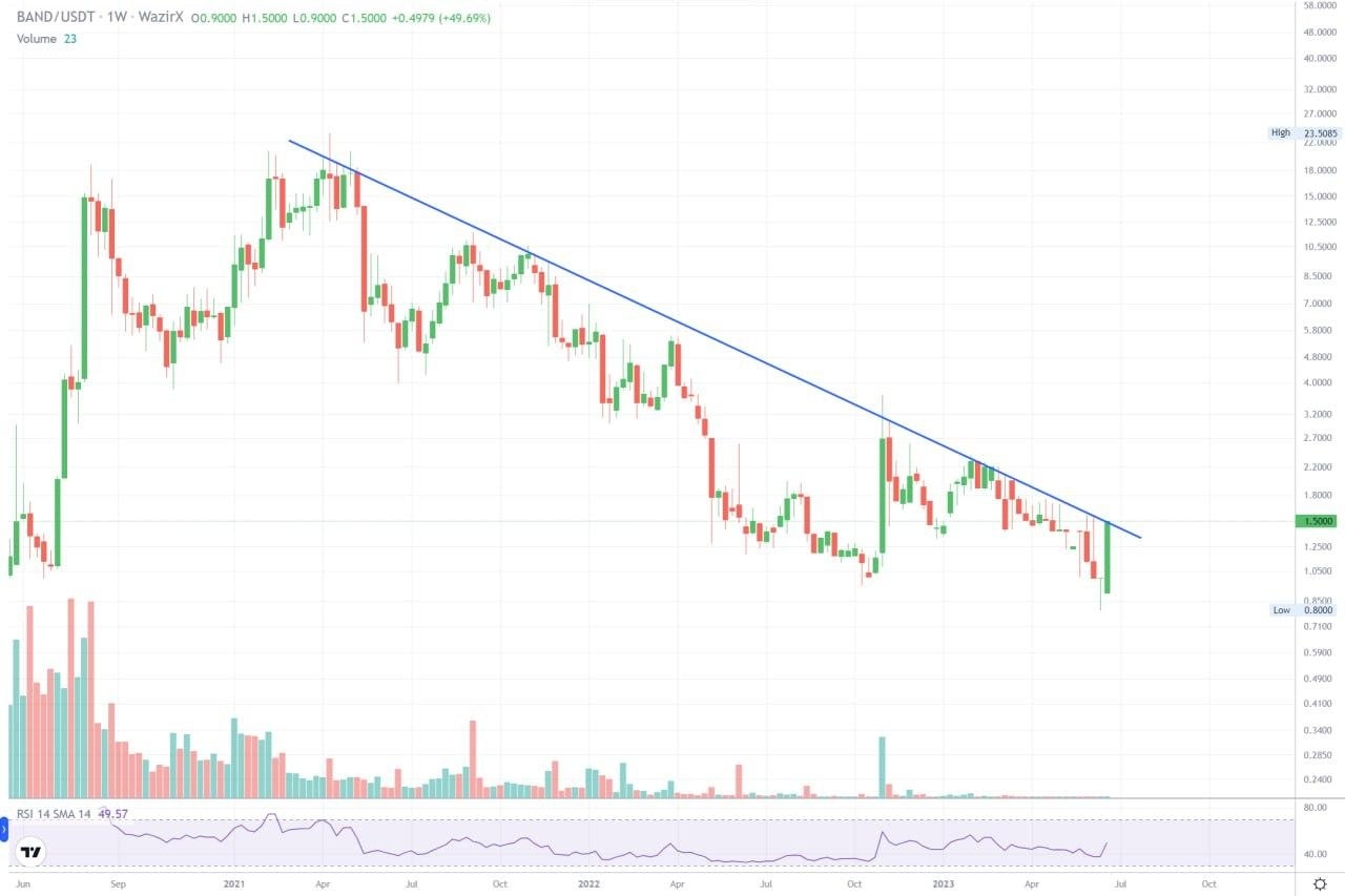 The weekly trend for BAND had been on the decline since May of 2022. The past few days have seen a steady rise in the price with the chart on the verge of a breakout from the descending trendline. The weekly RSI has nearly touched the 50-level indicating a buy signal. The next resistance is expected at $1.55 and an immediate support is expected at the $0.855 mark. Major Levels: Support: $0.55, $0.50 Resistance: $0.72, $0.90, $1.15(Views and recommendations given in this section are the analysts' own and do not represent those of Business Today. Please consult your financial adviser before taking any position in the asset/s mentioned.)