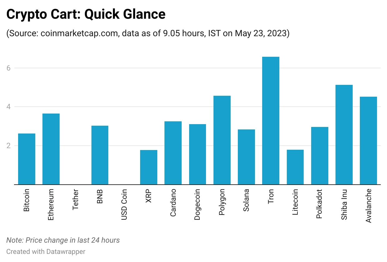 The global cryptocurrency market cap was trading higher, rising up to $1.14 trillion-mark as it jumped more than 2 per cent in the last 24 hours.Bitcoin and other top crypto tokens were moving higher on Tuesday as investors weighed the latest developments in the US debt ceiling stalemate. The digital asset market has been volatile amid macroeconomic uncertainties, which is guiding the sentiments in the near-term. Bitcoin was back in green on Tuesday as the largest crypto token jumped about 3 per cent to regain $27,000-mark. Its largest peer, Ethereum, was also surging higher, rose about 4 per cent to race past $1,850-levels. Other altcoins were also trading higher. "Crypto markets declined as the total market cap stood at $1.12 trillion ahead of just before the US President Joe Biden discussing the debt ceiling later in the day, Over the past month, Bitcoin has been mostly in a consolidation phase, experiencing a mere 2 per cent decline while managing to hold its value," said CoinDCX Research Team "On a positive sign, the rise in Bitcoin's social dominance, often indicative of fear in the market, raises the probability of a rebound. Furthermore, the heightened discussion surrounding Bitcoin following its price slump below $27,000 can be viewed as a positive sign for a potential pullback," it said. All the top crypto tokens, including stablecoins, were trading higher on Tuesday. Tron rallied 7 per cent, followed by a 5 per cent gains in Shiba Inu, Polygon and Avalanche each. Other altcoins including Cardano, Dogecoin, BNB, Polkadot and Solana rose up 3 per cent for the day. The global cryptocurrency market cap was trading higher, rising up to $1.14 trillion-mark as it jumped more than 2 per cent in the last 24 hours. However, the total trading volumes surged about 30 per cent to $27.64 billion. Crypto markets are trading slightly higher in the last 24 hours. The crypto fear and greed index remains in the neutral zone with 50 points, up 1 point. Investor sentiment continues to be cautious in the backdrop of the US debt ceiling discussions, said Parth Chaturvedi, Investments Lead, CoinSwitch Ventures. "In other news, a new report by TRM Labs highlights a decreasing trend in crypto hacks. The report shares that there has been a 70% decline in hacks from Q1 2022, while the average hack size has also shrunk. Hackers are increasingly settling for white-hat rewards from exploited projects," he added.