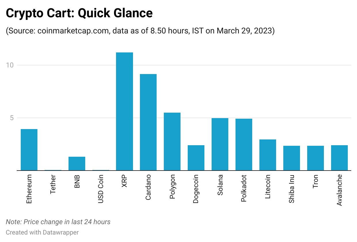 The global cryptocurrency market cap was trading significantly higher at $1.16 trillion, rising more than 2 per cent in the last 24 hours.Bitcoin and other crypto tokens were trading higher on Wednesday but the gains in the largest crypto assets were capped at the traders digested binance suit and awaited the key economic data later in the day. The ongoing week has been a tumultuous one for news for the cryptos. Commodity Futures Trading Commission (CFTC) reiterated before Congress that it believes ether is a commodity, which pushed the Ethereum higher and other crypto tokens in its orbit to the moon. Bitcoin was back in the rising trajectory as the largest crypto asset advanced more than a per cent to regain the $27,000 mark. Its largest peer, Ethereum, jumped as much as 4 per cent to hover close to the $1,800-level. Altcoins outperformed the headline peers and posted strong gains. In the last 24 hours, most cryptocurrencies experienced an increase in value due to the rise in US Consumer Confidence in March. Bitcoin's value increased and reclaimed its position above $27,000. it has the potential to reach the $30,000 level it lost during the June 2022 bear market, said Edul Patel, Co-founder and CEO at Mudrex. "Meanwhile, Ethereum outperformed BTC, with a gain of almost 4 per cent. The chairman of the CFTC recently reiterated his view that Ether is a commodity, not a security which is why Ether's value might be on the rise," he said. All the top crypto tokens were trading in green during the early trading hours on Wednesday. XRP rallied more than 11 per cent, while Cardano was up 9 per cent. Polygoin, Solana and Polkadot jumped 5 per cent each, whereas Litecoin was up by 3 per cent. The global cryptocurrency market cap was trading significantly higher at $1.16 trillion, rising more than 2 per cent in the last 24 hours. However, the total trading volumes declined sharply and fell over 4 per cent to $40.28 billion. The crypto market fell after the CFTC filed legal action against Binance and its CEO for operating an illegal exchange and a bogus compliance program. However, MicroStrategy's purchase of $150 million worth of bitcoin signals an increase in institutional confidence in the market, said Sathvik Vishwanath, Co-Founder and CEO at Unocoin. "Governments around the world are beginning to regulate the cryptocurrency market, which may lead to increased acceptance and adoption, but could also cause a temporary drop in the value of the cryptocurrency," he said.