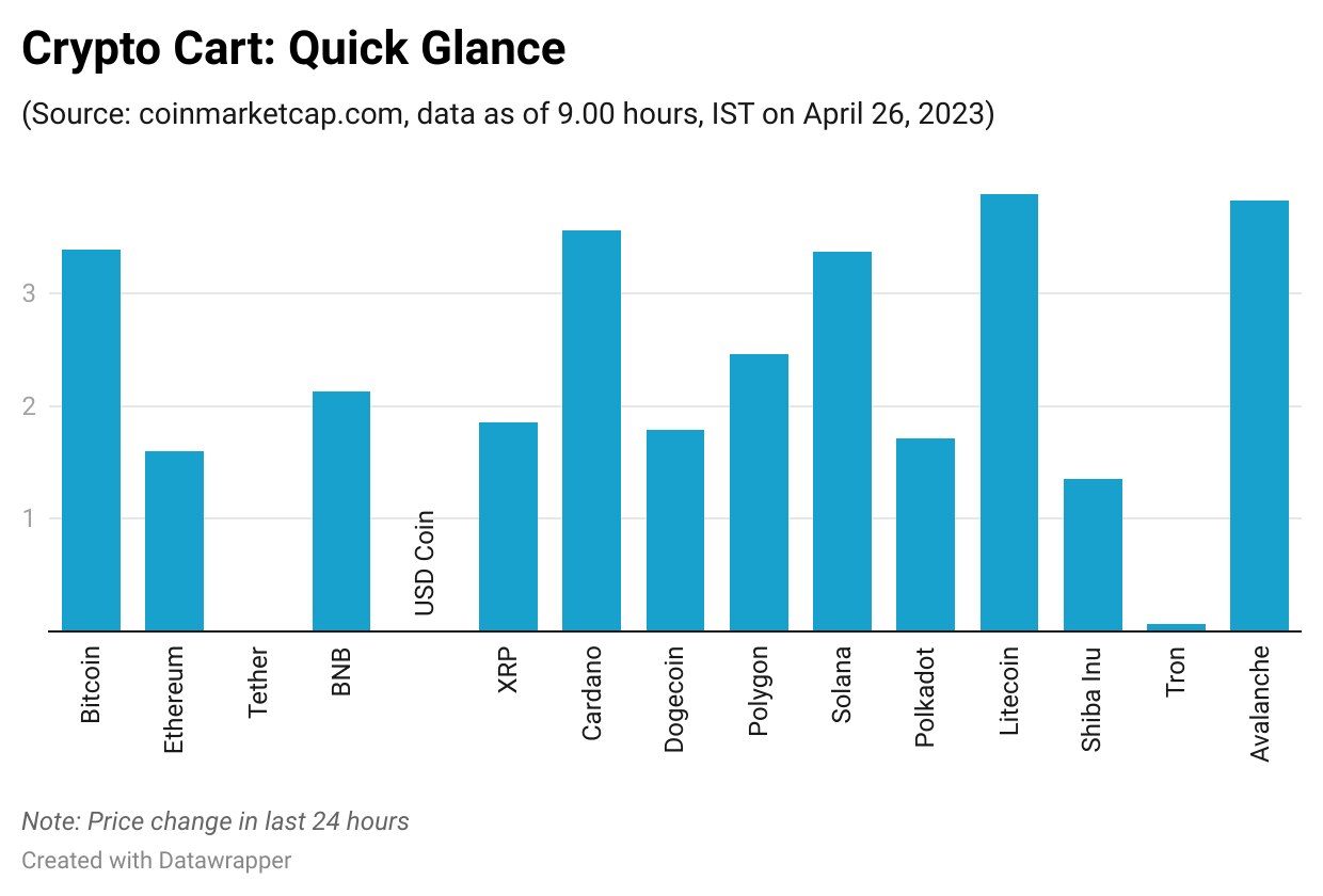 The global cryptocurrency market cap was trading significantly higher, hovering around the $1.18 trillion mark as it jumped more than 2 per cent in the last 24 hours.Bitcoin and other crypto tokens were trading decently higher on Wednesday. After five days of lingering below $28,000, bitcoin went for a surprising ride upward amid the muted performance by the US banks in Q4. Bitcoin was trading sharply higher as the largest crypto asset surged more than 3 per cent to regain the 28,000 mark. Its largest peer, Ethereum also rose about 2 per cent but remained below the $1,900 level. Altcoins, however, posted strong gains and were in line with the blue chips. In the past 24 hours, Bitcoin rose above the $28,000 level as investors reacted positively to the moderately optimistic Q1 earnings report from Alphabet and Microsoft, said Edul Patel, Co-founder and CEO at Mudrex. "On the other hand, the surge could also be attributed to concerns over banking stability following First Republic Bank's announcement that it lost $100 billion in deposits during its Q1 earnings presentation BTC saw an increase of over 3% in the last 24 hours, while Ethereum also experienced a gain of nearly 2 per cent and is presently trading at the $1,860 level," he said. Barring the US dollar-pegged USD Coin, all other top tokens were trading higher on Wednesday. Litecoin, Avalanche and Cardano jumped as much as 4 per cent, each, whereas Solana increased over 3 per cent. Polygon, BNB, Dogecoin and XRP added 2 per cent, each. The global cryptocurrency market cap was trading significantly higher, hovering around the $1.18 trillion mark as it jumped more than 2 per cent in the last 24 hours. However, the total trading volumes increased about 11 per cent to $40.59 billion. The Bitcoin price is currently hovering around $28,300. The recent rally in Bitcoin price can be attributed to technical buying ahead of the 50-day moving average and near-term support levels. With a short-term buy signal triggered less than a week ago, historical trends suggest that Bitcoin could experience a 7 per cent gain over the next 10 days, said Sathvik Vishwanath, Co-Founder & CEO, Unocoin. "The broader story surrounding bitcoin's rise has been driven by safe-haven demand amid fears of a banking crisis, a recovery in market conditions and a belief that the Fed's tightening cycle is coming to an end. Bitcoin should remain supported in the medium to long term, with on-chain indicators suggesting that the cryptocurrency has entered a new bull market," he said. Blockchain adoption entity Tezos India has joined hands with Zeeve, a Web3 infrastructure provider, to enable businesses and developers to adopt blockchain technology without any hassle. The combined power of the two brands will empower web 2.0 businesses to come on-chain and help developers at a mass level to deploy their applications on the blockchain.