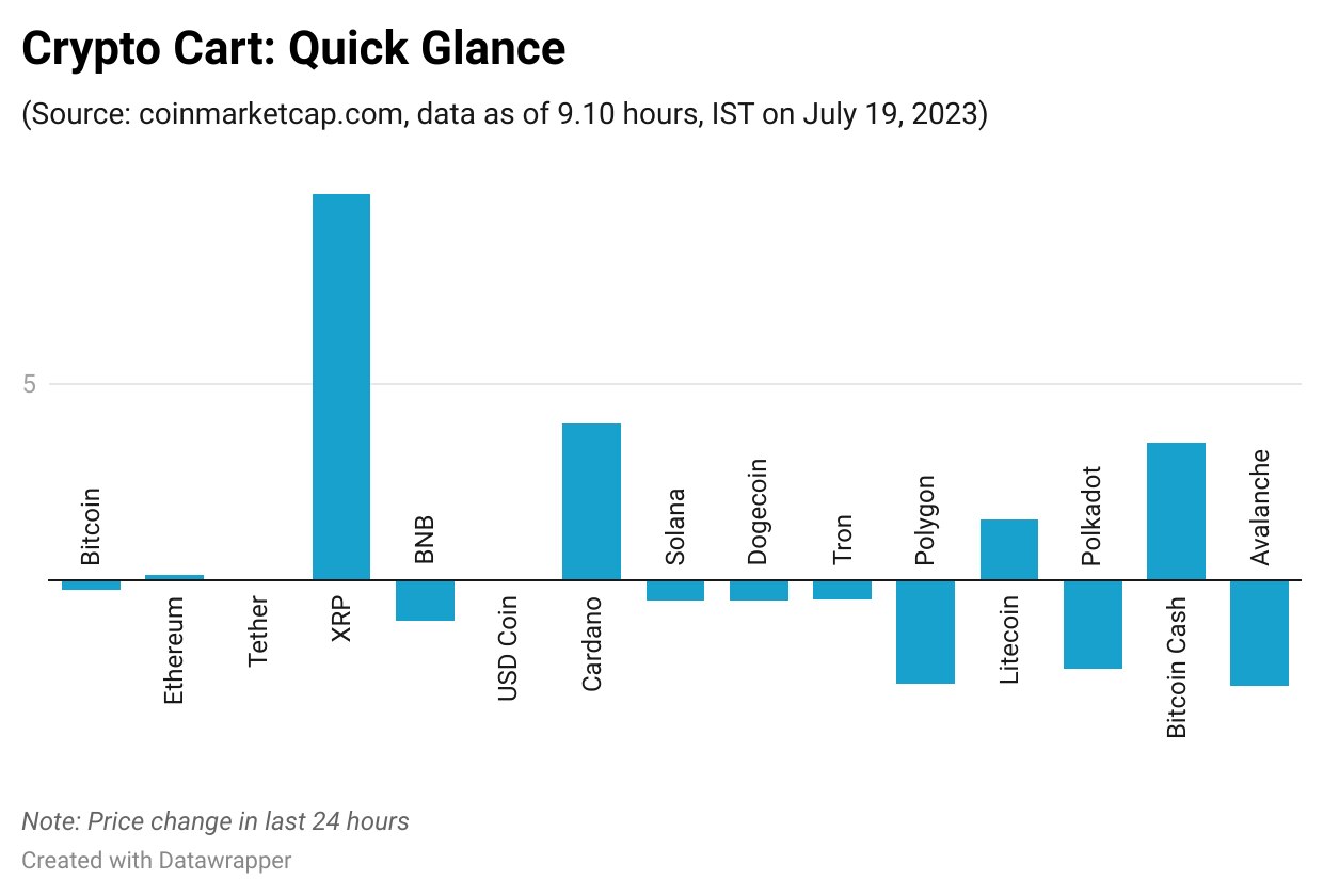 The global cryptocurrency market cap was trading slightly higher, rising to $1.21 trillion-mark, as it advanced marginally, less than a per cent in the last 24 hours.Bitcoin and other crypto tokens were mixed on Wednesday as the traders looked for the decisive cues. The range-bound movement continued in the digital market in the absence of key economic events. However, the optimism over Bitcoin ETFs supported the sentiments. Bitcoin weakened further but managed to recover from the sharp losses as the largest crypto token held above $30,000-mark. However, Its largest peer, Ethereum, was slightly up and firmed above $1,900-level. Price in the action altcoins was mixed during the early hours. Bitcoin experienced a temporary decline to the $29,800 level, but it quickly recovered and surpassed the $30,000 mark for the second consecutive day. Although BTC has been down for three consecutive days, it has shown an impressive year-to-date gain of over 84 per cent, said Edul Patel, Co-founder and CEO at Mudrex. "Despite efforts from bears to push BTC lower, the bulls are determined to keep it above the $30,000 threshold. In contrast, XRP has outperformed BTC by maintaining its winning streak for a third day, with gains of over 9 per cent in the past 24 hours and more than 70 per cent in the past week. Additionally, Ethereum has also remained above the $1,900 level," he added. Top crypto tokens were trading mixed on Wednesday. Among the gainers, XRP surged about 10 per cent, while Cardano and Bitcoin Cash were up 4 per cent each. Litecoin gained 2 per cent. On the contrary, Avalanche and Polygon were down 3 per cent each, while Polkadot shed over 2 per cent. The global cryptocurrency market cap was trading slightly higher, rising to $1.21 trillion-mark, as it advanced marginally, less than a per cent in the last 24 hours. However, the total trading volumes dropped about 7 per cent to $32.78 billion. Crypto markets were little changed but investors remained optimistic about the prospects of Bitcoin exchange-traded funds (ETFs), the SEC recently approved a second spot Bitcoin ETF application for review from asset manager Valkyrie, following the approval of a similar application from BlackRock the previous week, said CoinDCX Research Team. "This signals that the SEC is open to the idea of spot Bitcoin ETFs, which could provide a major boost to the crypto market. Glassnode reported that the largest number of unspent transaction outputs (UTXOs) were created at a price of $30,200. This suggests that there is significant demand for BTC at this level, despite the recent price volatility," it added.