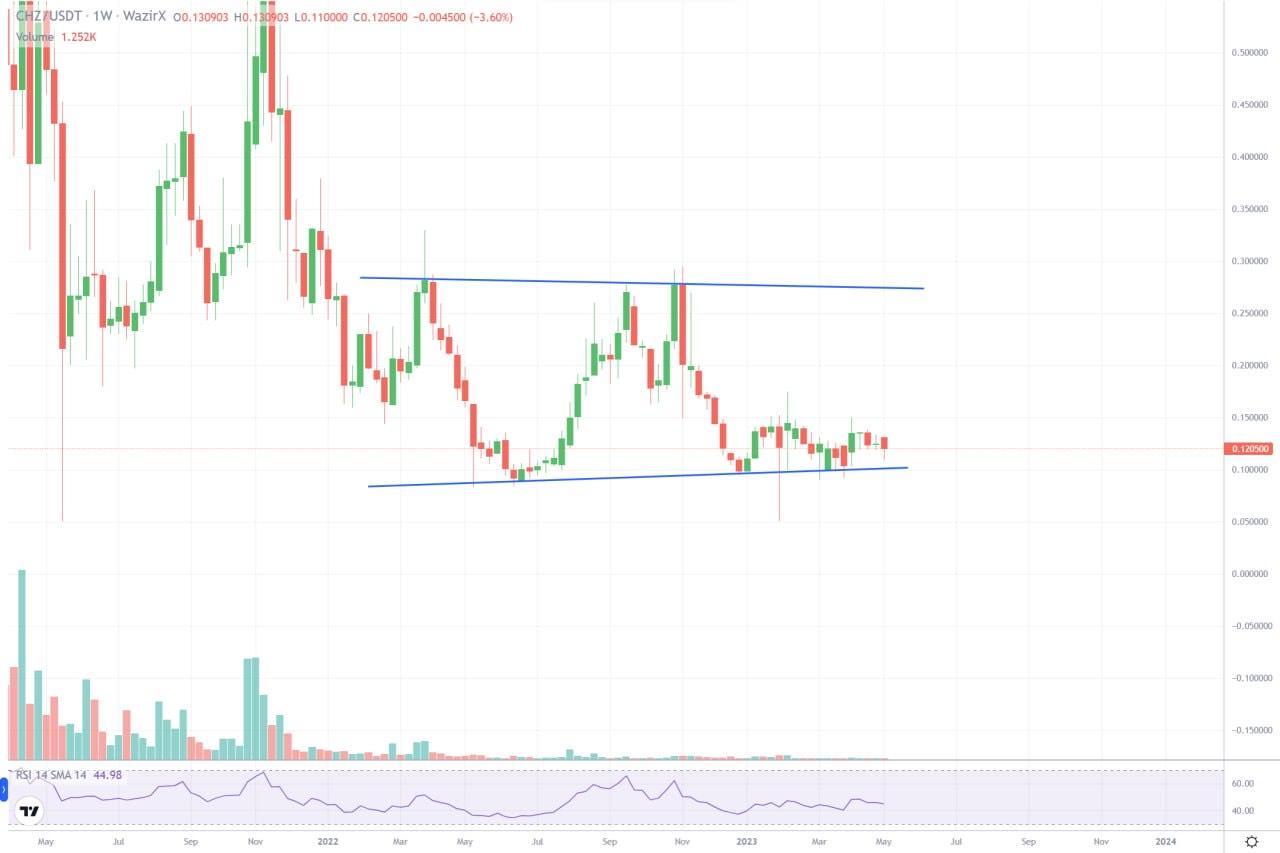 On the weekly time frame, CHZ can be seen traversing within a triangle pattern, trading close to the support levels. However, we could expect a bounce back from the lower trendline in the coming days. The next resistance is expected at $0.15 and immediate support is expected at the $0.10 level.