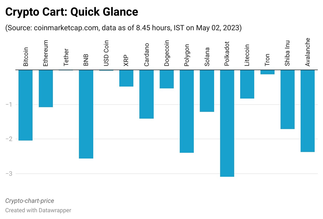 All the top crypto tokens were trading lower on Tuesday. However, the fall in the altcoins was not very steep following the recent correction. Polkadot and BNB plunged about 3 per cent, each, followed by Polygon, Avalanche, and Shiba Inu dropped over 2 per cent, each.