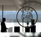 European football's governing body UEFA gathers in Amsterdam on Monday for their annual congress as they face up to the possible impact of the coronavirus on the Euro 2020 championship and this month's playoffs. Soccer Football - Europa League - Round of 16 draw - Nyon, Switzerland - February 28, 2020 General view of the UEFA logo at UEFA Headquarters before the draw.