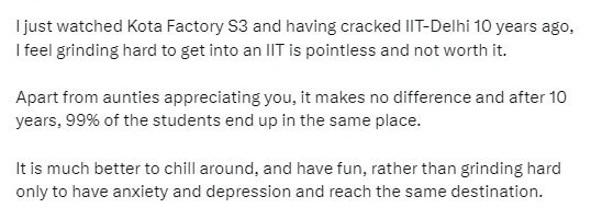 "I just watched Kota Factory S3 and having cracked IIT-Delhi 10 years ago, I feel grinding hard to get into an IIT is pointless and not worth it. Apart from aunties appreciating you, it makes no difference and after 10 years, 99 per cent of the students end up in the same place. It is much better to chill around, and have fun, rather than grinding hard only to have anxiety and depression and reach the same destination," he wrote. The post, however, was deleted later.