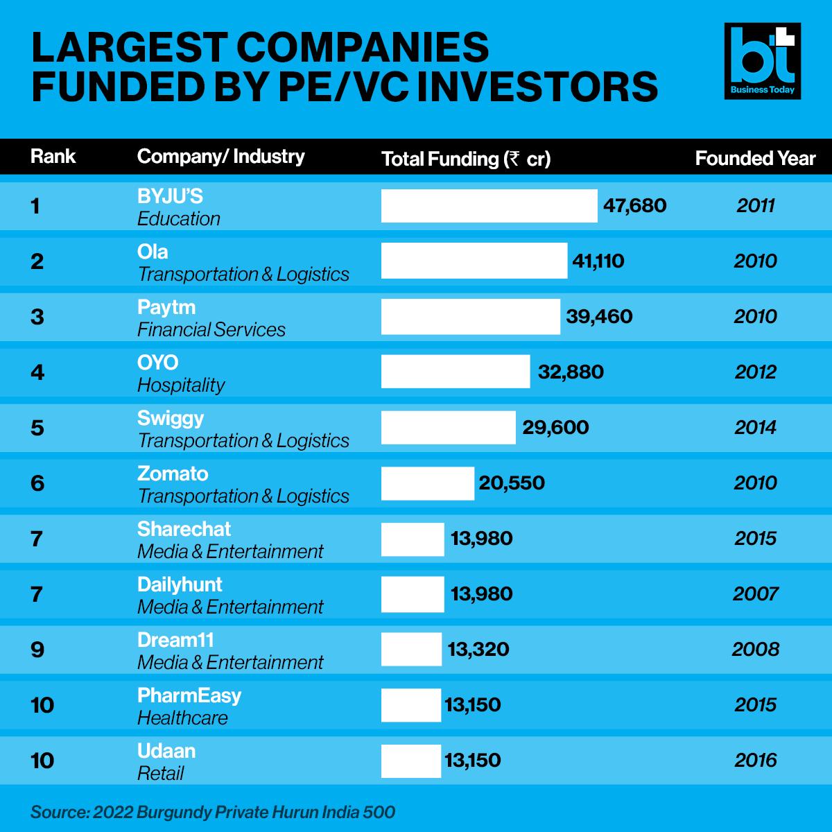 While BYJU’S has raised a total funding of Rs 47,680 crore, Ola, Paytm and OYO have raised Rs 41,110 crore, Rs 39,460 crore, and Rs 32,880 crore, respectively.