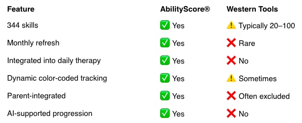 Unlike traditional assessments that look for “presence or absence” of a milestone, AbilityScore® tracks depth, consistency, and application across domains.