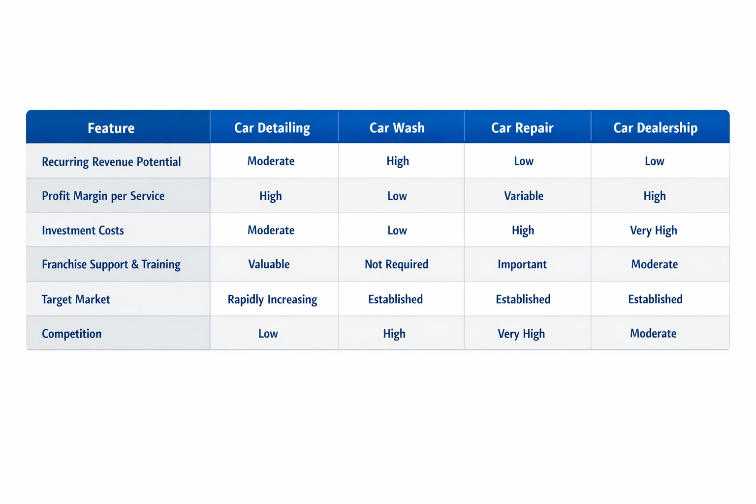 Finally, while the demand for the car detailing service is high, so is the growth in the number of players. Success in a competitive market requires unwavering commitment to the brand's standards, high-quality work, and exceptional customer service, as the operational demands require a hands-on, detail-oriented management approach.
