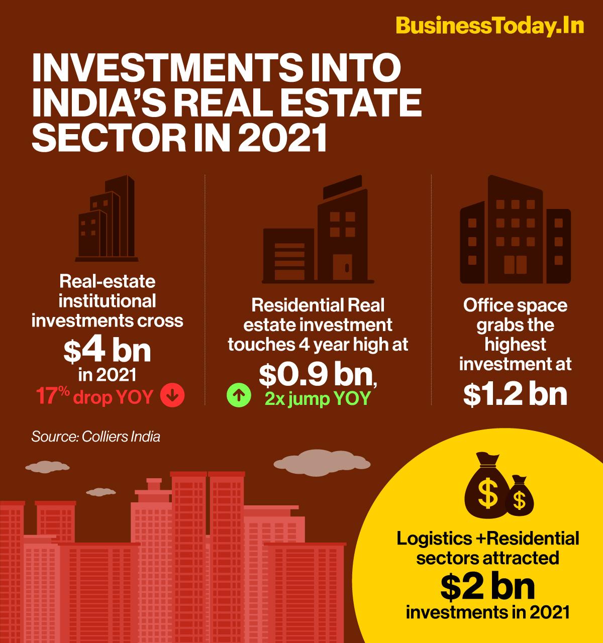 Investments into residential real estate touches a 4 year high at $0.9 billion in 2021 according to a Colliers India report n