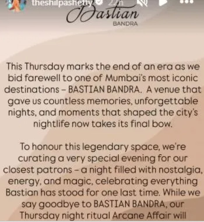 Despite the closure of the Bandra location, Shetty confirmed that the Bastian at the Top outlet will remain open and will offer "new experiences". The popular Thursday event, Arcane Affair, will also be relocated to the Worli property. To commemorate the Bandra location, a "very special evening" has been planned for its patrons, promising a night of "nostalgia, energy, and magic".