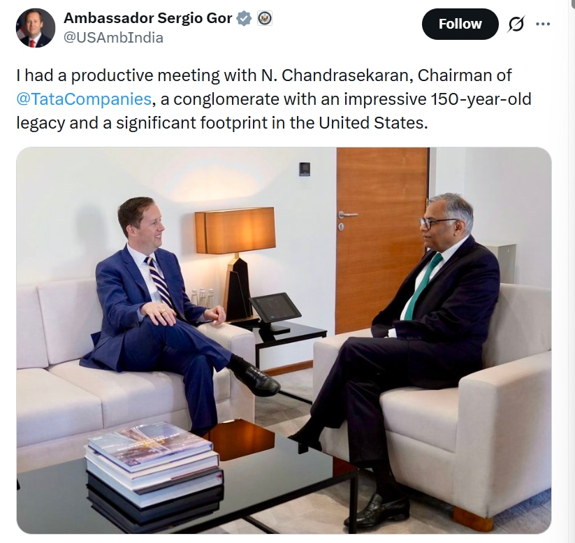 Previously, Sergio Gor met N Chandrasekaran, Chairperson of Tata Companies.