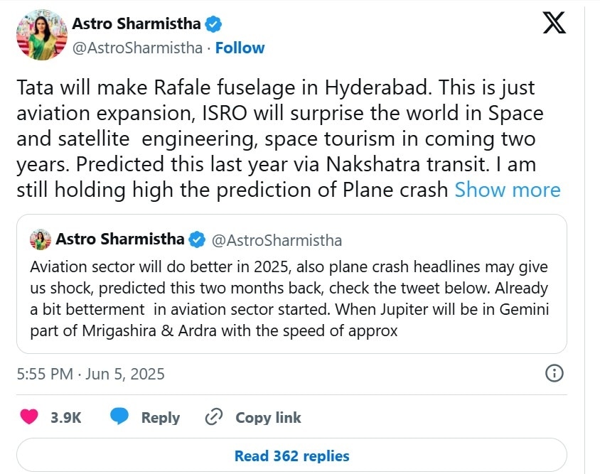 On the day of the crash, Sharmistha posted, "It is very unfortunate that we lost so many lives in the Air India crash in Ahmedabad," further connecting the event to astrological occurrences by mentioning, "Jupiter is yet to enter Ardra, and India’s Mars Mahadasha is yet to begin—yet so much has already started." These comments were seen as opportunistic by many X users, especially since she had earlier claimed to foresee "a plane crash and destruction in aviation in 2025."