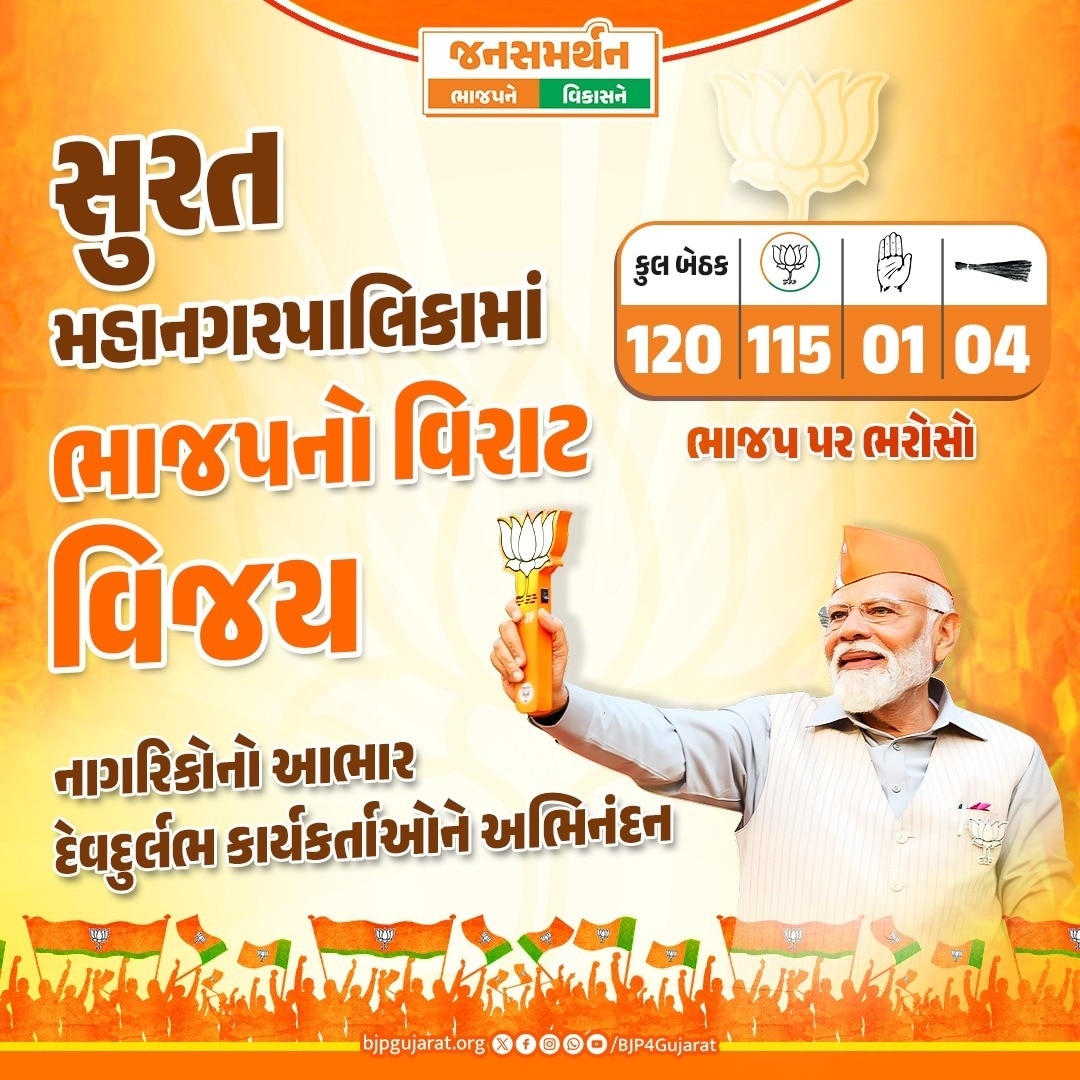 BJP’s Gujarat sweep deals fresh blow to KejriwalGujarat Civic Polls Result: The Aam Aadmi Party (AAP) suffered another political setback in Gujarat as the Bharatiya Janata Party (BJP) swept the Surat Municipal Corporation election, winning 115 of 127 seats and further tightening its long-standing hold over the civic body.