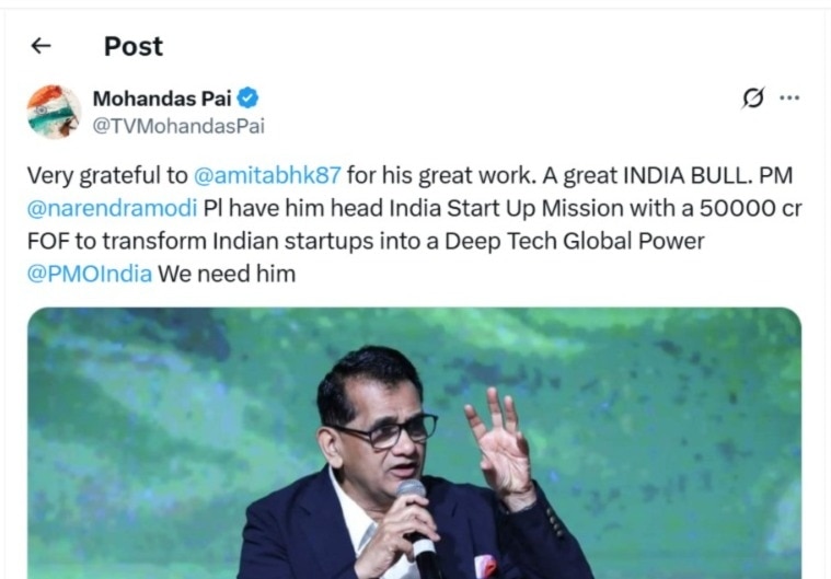 Amitabh Kant stepped down from his role as G20 SherpaFollowing Amitabh Kant's resignation as India's G20 Sherpa, Aarin Capital chairman Mohandas Pai on Monday urged Prime Minister Narendra Modi to appoint him to lead a national startup initiative with significant funding support. "Very grateful to Amitabh Kant for his great work. A great INDIA BULL. PM Narendra Modi, Pl have him head India Start-Up Mission with a 50000 cr FOF (fund of funds) to transform Indian startups into a Deep Tech Global Power. PMO, We need him," Pai wrote on X.