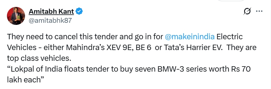 Amitabh Kant urges Lokpal to scrap BMW tenderFormer NITI Aayog CEO Amitabh Kant on Tuesday weighed in on the anti-graft ombudsman Lokpal's tender to buy luxury cars, urging it to cancel the order and instead choose electric vehicles made in India. "They need to cancel this tender and go in for @makeinindia, Electric Vehicles — either Mahindra's XEV 9E, BE 6 or Tata's Harrier EV. They are top class vehicles," Kant said on X.