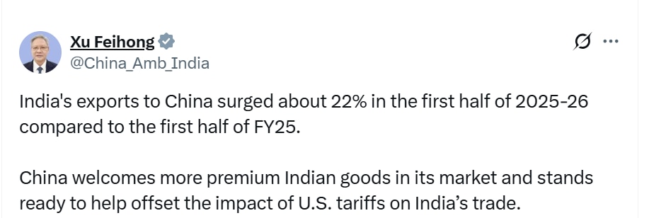 'China ready to offset U.S. tariff hit': Envoy Xu signals trade support for IndiaChina has signalled its willingness to help India offset the impact of U.S. tariffs, even as India's exports to China recorded a sharp 22% surge in the first half of 2025–26. "India's exports to China surged about 22% in the first half of 2025–26 compared to the first half of FY25. China welcomes more premium Indian goods in its market and stands ready to help offset the impact of U.S. tariffs on India's trade," Chinese Ambassador to India Xu Feihong said on Sunday.