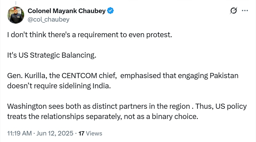 Former Colonel Mayank Chaubey also played down the remarks, calling them part of Washington's strategic balancing. "I don't think there's a requirement to even protest. It's US strategic balancing. Gen. Kurilla, the CENTCOM chief, emphasised that engaging Pakistan doesn't require sidelining India. Washington sees both as distinct partners in the region. Thus, US policy treats the relationships separately, not as a binary choice."