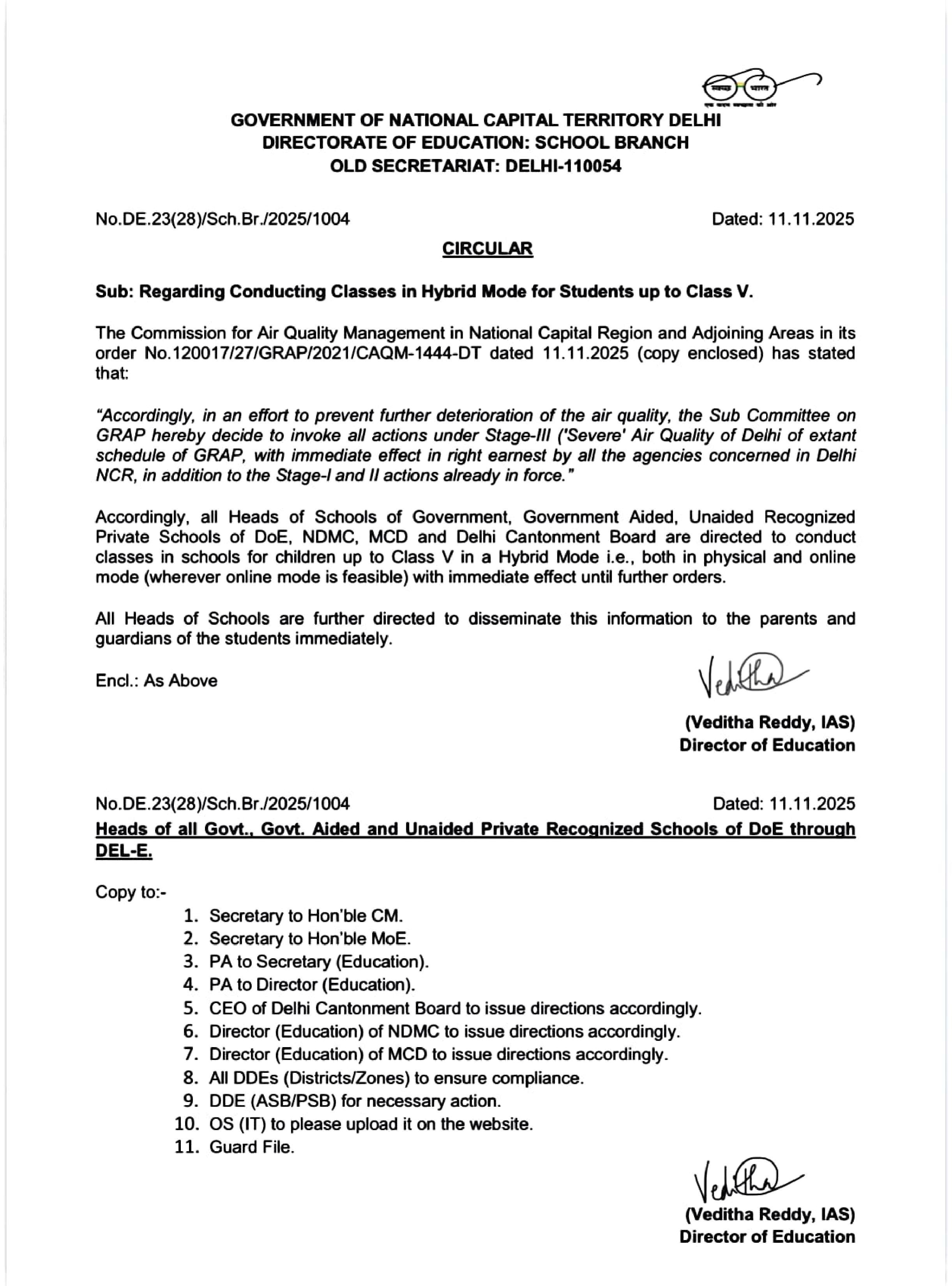 Delhi air pollution: Schools directed to hold classes in hybrid mode for students up to Class 5Given the worsening air quality in Delhi, the Rekha Gupta-led government has directed all schools across the national capital to conduct classes for children up to Class 5 in the hybrid mode. The circular mentioned that the preventive measure was in keeping with the Stage-3 of the Graded Response Action Plan (GRAP) guidelines that have been imposed in the national capital after the air quality reached 'severe' levels.