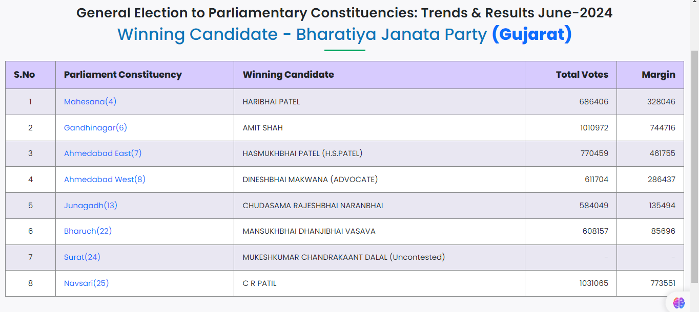 Gujarat Lok Sabha Results 2024: Incumbent Union Home Minister Amit Shah has won from Gandhinagar with a wide margin of over 7.4 lakh votes. He was up against Sonal Ramanbhai Patel from the Indian National Congress.