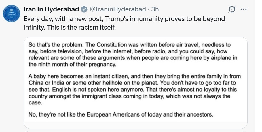 In a separate response, Iran said, "Every day, with a new post, Trump's inhumanity proves to be beyond infinity. This is the racism itself."