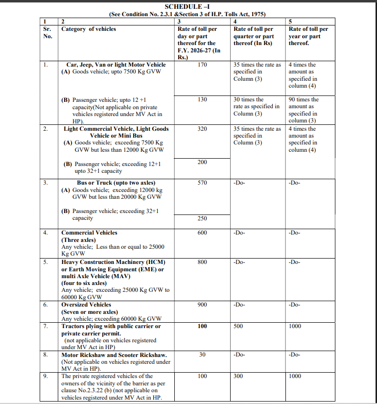 According to the government, this will reduce congestion, improve commuter convenience and prevent revenue leakage.The Himachal Pradesh government, led by Chief Minister Pushkar Singh Dhami, has revised its toll tax rates under the Toll Policy 2026-27. The revised toll tax rates will be effective from April 1, 2026. These will apply primarily to out-of-state vehicles, including cars, vans, jeeps, buses, trucks, and earth-moving equipment, among others.