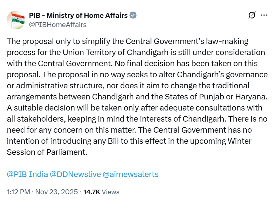 "The proposal only to simplify the Central Government’s law-making process for the Union Territory of Chandigarh is still under consideration with the Central Government. No final decision has been taken on this proposal," the ministry said in a statement on X.