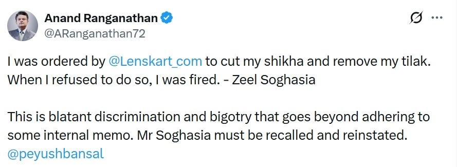 In a video message, Zeel Soghasia said, "I was ordered by @Lenskart_com to cut my shikha and remove my tilak. When I refused to do so, I was fired."