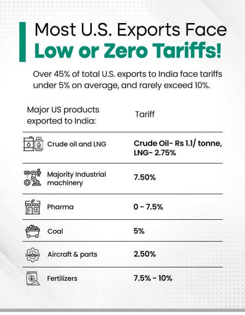 Major US exports like crude oil, LNG, industrial machinery, and pharmaceuticals enjoy relatively low tariffs in India. For example, crude oil and LNG face minimal tariffs of Rs 1.1 per tonne and 2.75%, respectively. Aircraft and parts are charged just 2.5%, while pharmaceuticals see a tariff range from 0 to 7.5%.