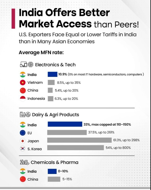 India's market access is also more favorable than many other countries in Asia. US exporters face lower or similar tariffs in India compared to markets like China, Vietnam, or South Korea. For instance, India's electronics and tech tariff stands at 10.9%, higher than Vietnam's 8.5%, but significantly lower than China's 5.4%. Similarly, India's tariffs on dairy and agriculture products are competitive globally, with India's 33% lower than Japan's 61.3% and South Korea’s 54%.