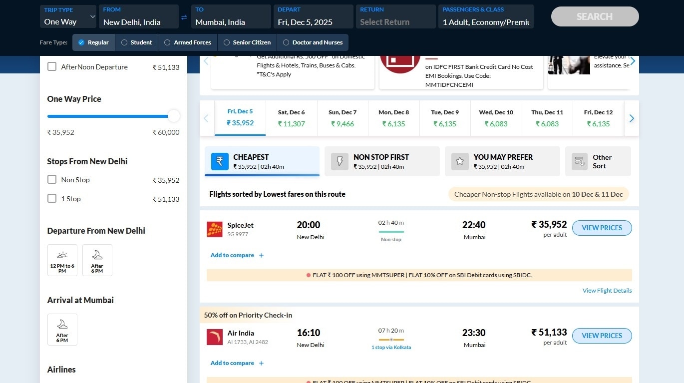 On the heavily congested Delhi-Mumbai sector, the cheapest non-stop fare available on December 5 was ₹35,952 (SpiceJet, 20:00-22:40). A one-stop option on Air India for the same day cost ₹51,133.