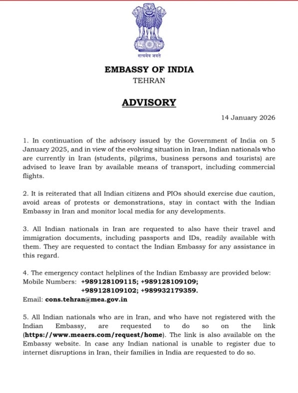 All Indian nationals — businesspersons, students, pilgrims, and tourists — have been asked to leave the country using available means, including commercial flights.The Indian Embassy in Tehran on Wednesday advised all Indian nationals stranded in Iran to leave the country immediately, given the ongoing protests against the Ayatollah Khamenei regime.