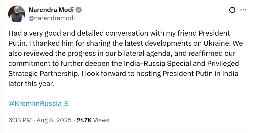 He further said that he had a “very good and detailed conversation” with Putin. In this conversation, the two leaders also took stock of the progress in bilateral cooperation between India and Russia.