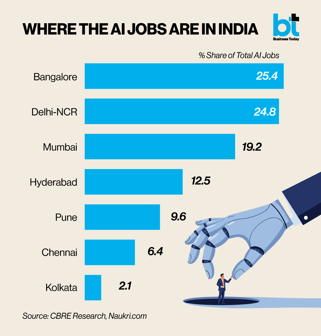 According to an analysis by CBRE Research, based on a comprehensive study of 64,500 active job listings on job platform Naukri.com as of December 2025, revealed that Bengaluru is the primary hub of all AI jobs, commanding a 25.4 per cent share of the total AI-related jobs. In a close second is Delhi-NCR with a share of 24.8 per cent.