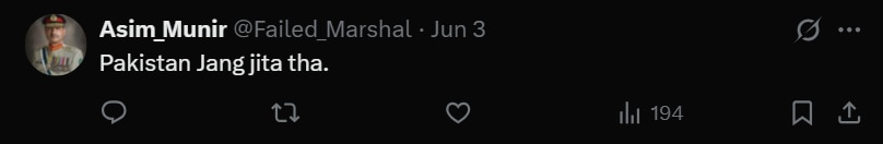 "Pakistan jang jita hai," a user who goes by @Failed_Marshal commented in jest.