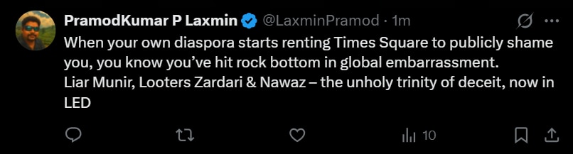 "When your own diaspora starts renting Times Square to publicly shame you, you know you've hit rock bottom in global embarrassment. Liar Munir, Looters Zardari and Nawaz - the unholy trinity of deceit, now in LED," a social media user commented.
