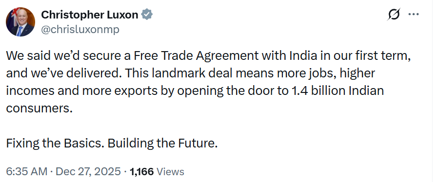 “We said we’d secure a Free Trade Agreement with India in our first term, and we’ve delivered. This landmark deal means more jobs, higher incomes and more exports by opening the door to 1.4 billion Indian consumers,” Luxon wrote.