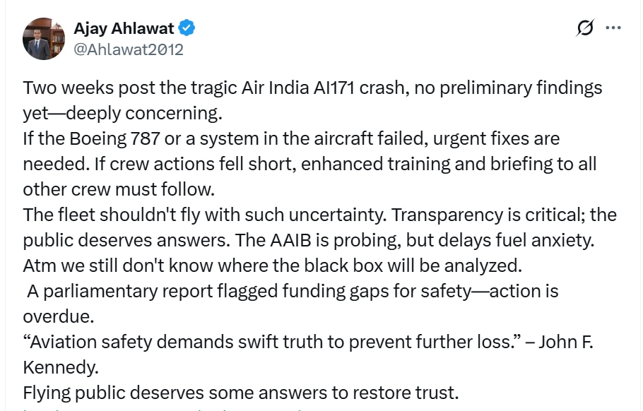 Ahlawat also referenced concerns raised earlier in a parliamentary report. "A parliamentary report flagged funding gaps for safety — action is overdue. Aviation safety demands swift truth to prevent further loss," he quoted, citing John F. Kennedy: "Aviation safety demands swift truth to prevent further loss."