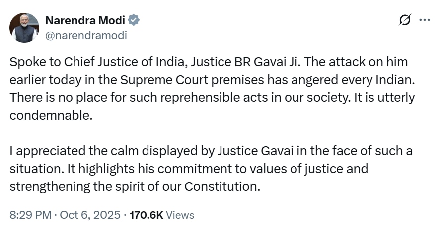 "Spoke to Chief Justice of India, Justice BR Gavai Ji. The attack on him earlier today in the Supreme Court premises has angered every Indian. There is no place for such reprehensible acts in our society. It is utterly condemnable. I appreciated the calm displayed by Justice Gavai in the face of such a situation. It highlights his commitment to values of justice and strengthening the spirit of our Constitution," the Prime Minister wrote on X.