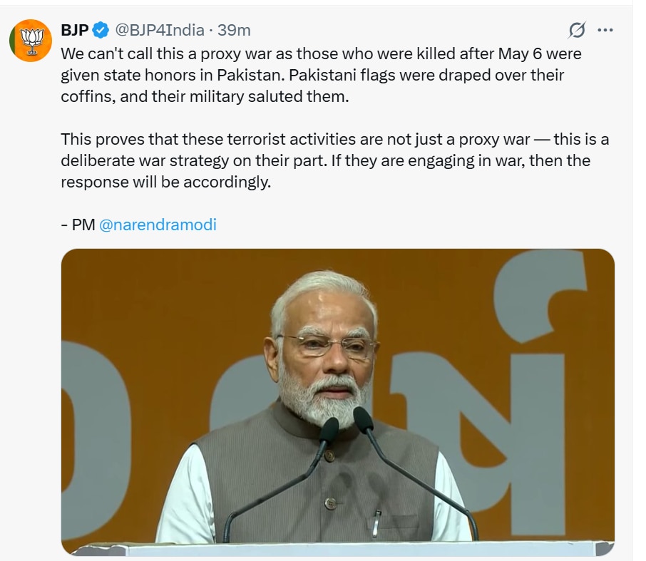 ‘No longer a proxy war’: Modi cites state honours for terrorists in PakistanPrime Minister Narendra Modi on Tuesday said the events following India's Operation Sindoor had made it clear that terrorism is no longer a “proxy war” but an openly declared strategy by Pakistan. Speaking in Gandhinagar, Modi cited state honours given to terrorists killed after May 6, saying, "I say this can no longer be called a proxy war because the terrorists whose funerals were held after May 6 were given state honours in Pakistan. Pakistan's flags were placed on their coffins, and their army saluted them."