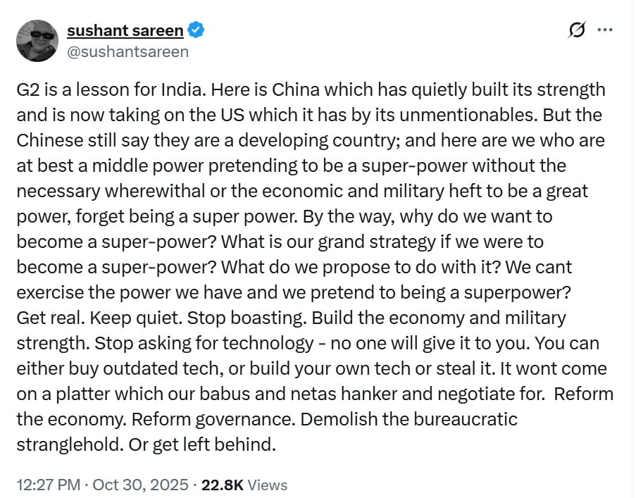 "G2 is a lesson for India. Here is China which has quietly built its strength and is now taking on the US. But the Chinese still say they are a developing country; and here are we who are at best a middle power pretending to be a super-power without the necessary wherewithal or the economic and military heft to be a great power, forget being a super power," Sareen wrote on X.