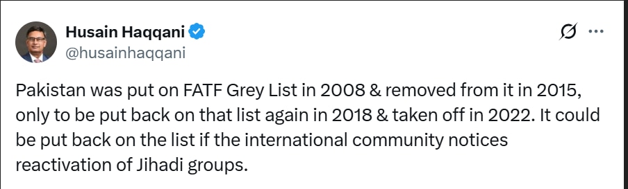 "Pakistan was put on FATF Grey List in 2008 & removed from it in 2015, only to be put back on that list again in 2018 & taken off in 2022. It could be put back on the list if the international community notices reactivation of Jihadi groups," Haqqani wrote on X.