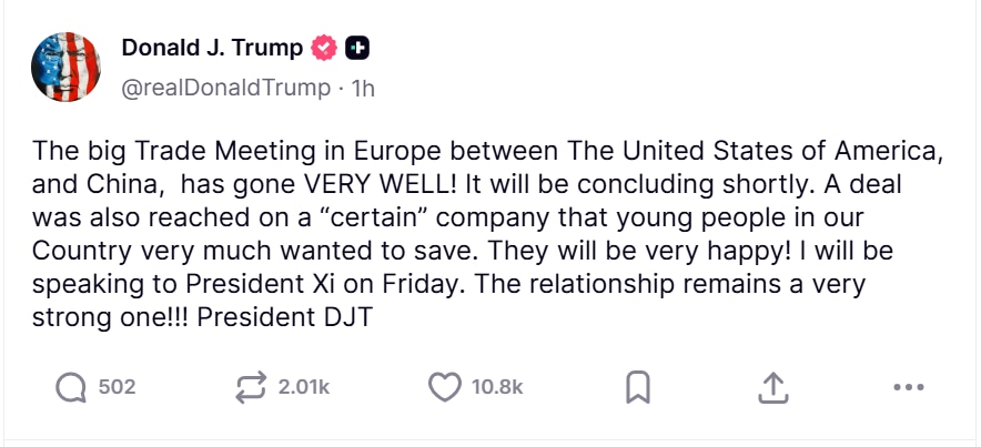 In a post on Truth Social, Trump wrote: "The big Trade Meeting in Europe between The United States of America, and China, has gone VERY WELL! It will be concluding shortly. A deal was also reached on a ‘certain’ company that young people in our Country very much wanted to save. They will be very happy! I will be speaking to President Xi on Friday. The relationship remains a very strong one!!! President DJT."