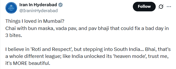 That was not it. Iran also took the food pun and meme route to roast the US President. Reposting the video shared by Iran's Mumbai consulate, its Hyderabad counterpart listed the 3 things that they absolutely loved in India's maximum city.