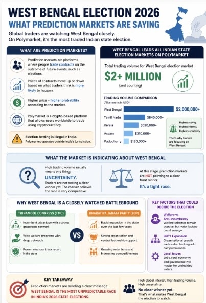The first phase of the West Bengal Assembly elections will take place on Thursday, covering 152 constituencies across 16 districts.West Bengal elections: As India approaches the 2026 state elections, an unconventional data source is offering insight into how the West Bengal contest is being viewed globally — prediction markets. The first phase of the West Bengal Assembly elections will take place on Thursday, covering 152 constituencies across 16 districts, with polling scheduled from 7 am to 6 pm.
